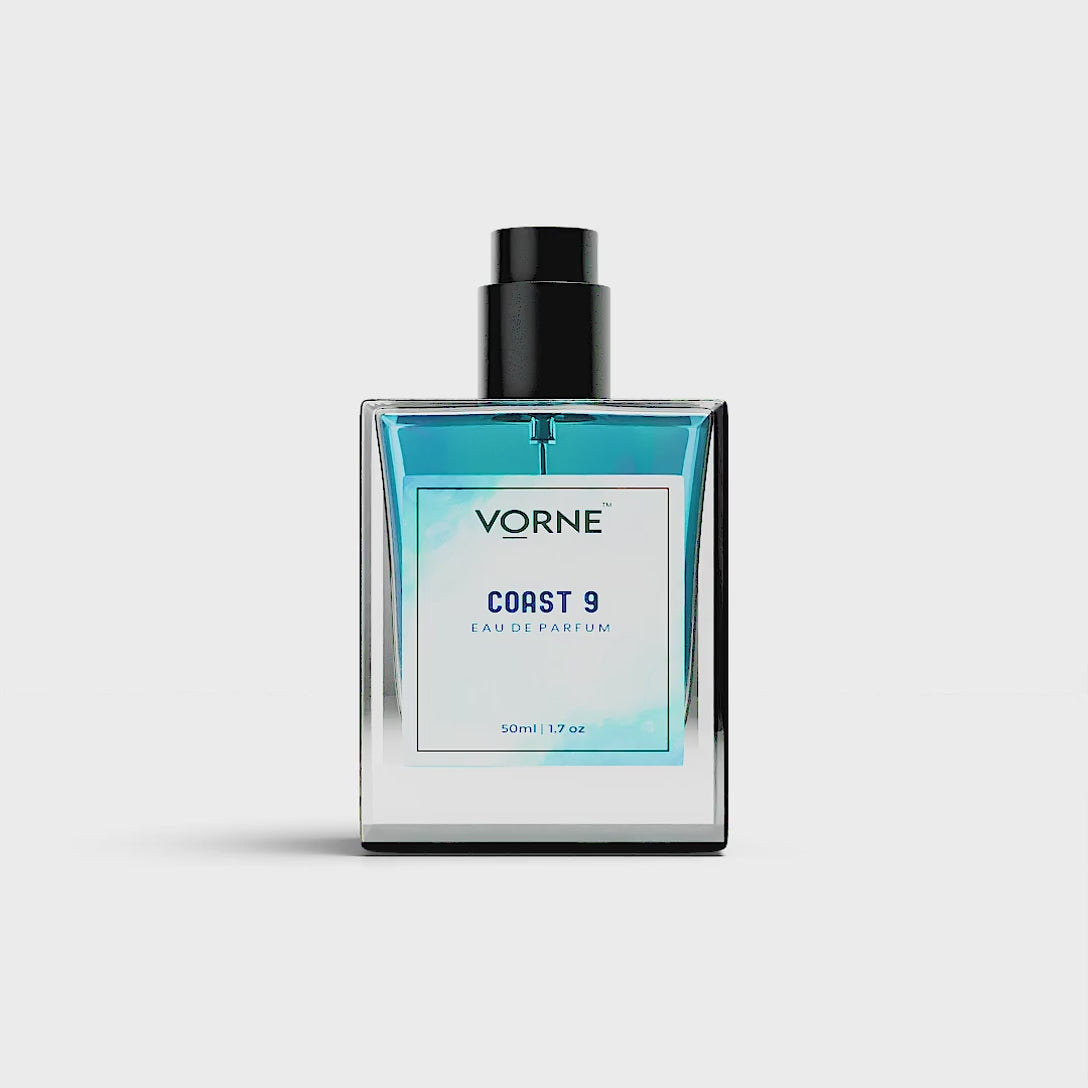 VORNE Coast 9 opens with a crisp aquatic rush, where cool mint and aromatic lavender set an instant tone of clarity and confidence. The heart unfolds into smooth neroli and refined geranium, adding a subtle elegance that feels effortless and modern. As it settles, warm amber and soft musk leave behind a clean, masculine trail that lingers without overpowering.