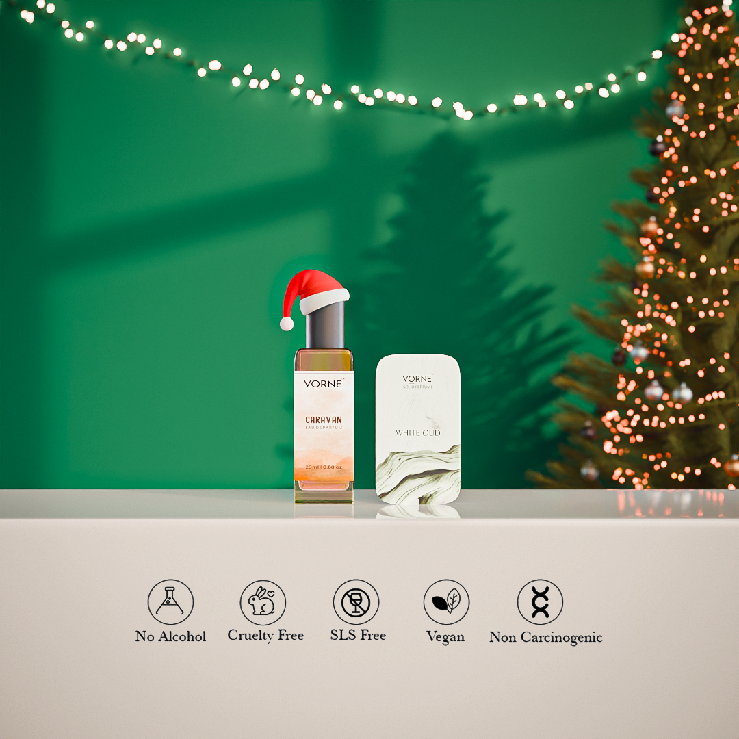 Celebrate this festive season with the VORNE Caravan Eau De Parfum and White Oud Solid Perfume Combo for Men, a refined and luxurious Christmas gift choice. Caravan offers a warm, adventurous scent with rich woody and spicy notes perfect for winter evenings, while White Oud adds smooth elegance with bergamot, oud, rose and sandalwood in a convenient solid perfume format.