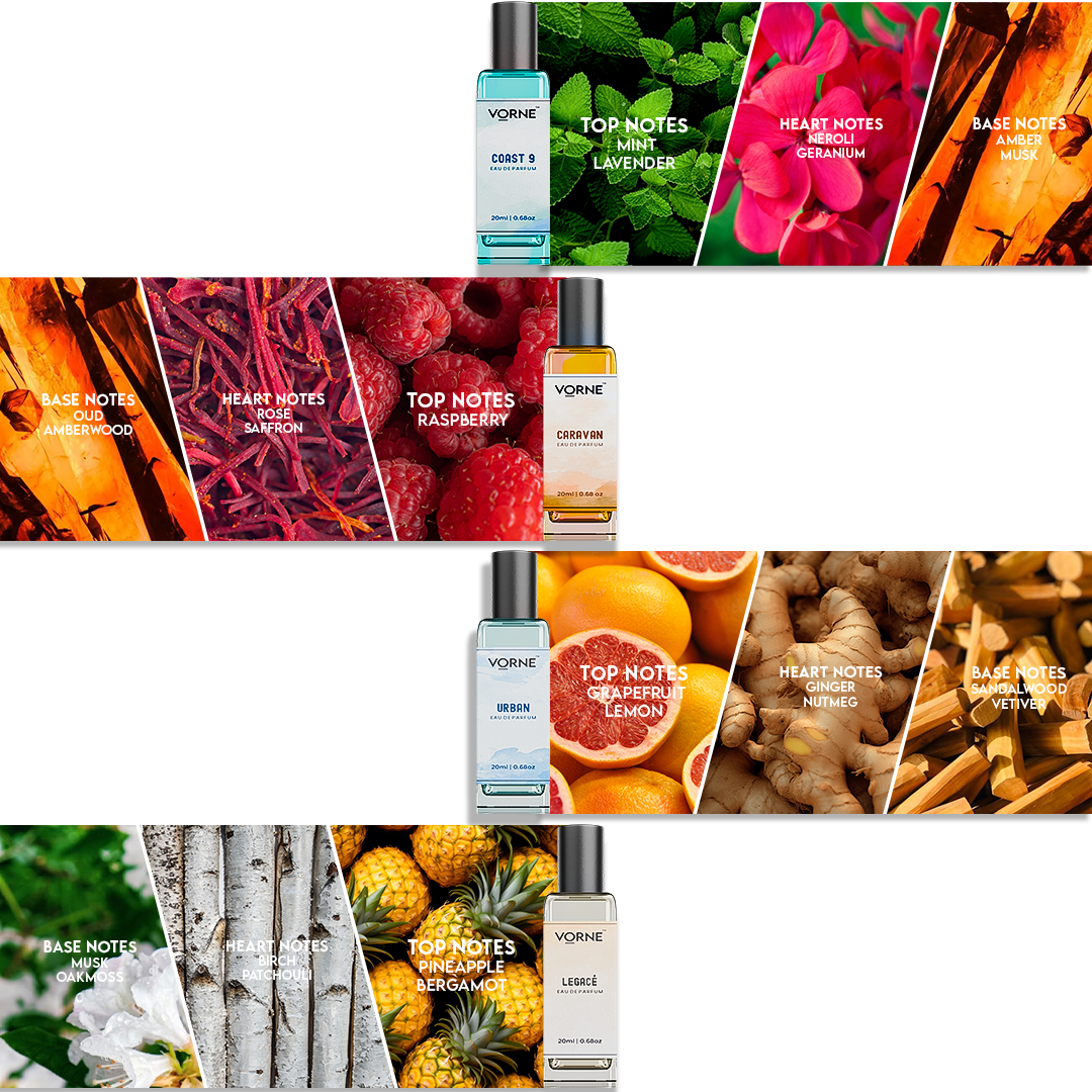 Four premium Eau De Parfums in one luxury gift box. Four of VORNE's best men's EDPs in 20ml travel-friendly bottles - a complete scent collection for every occasion.