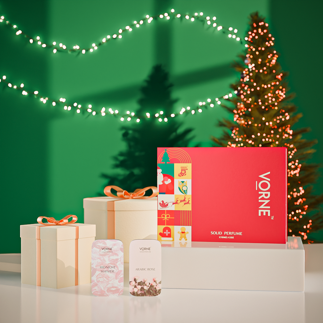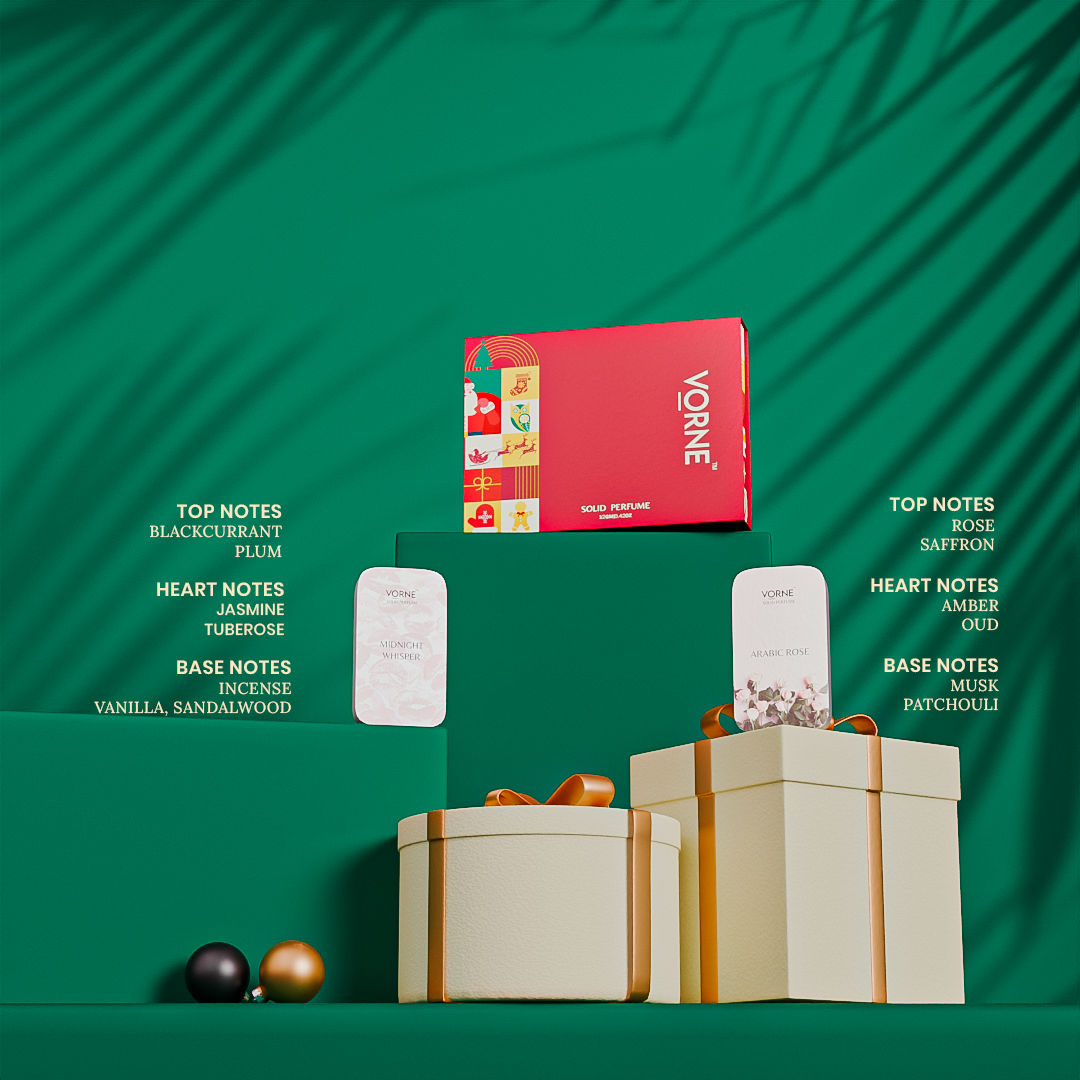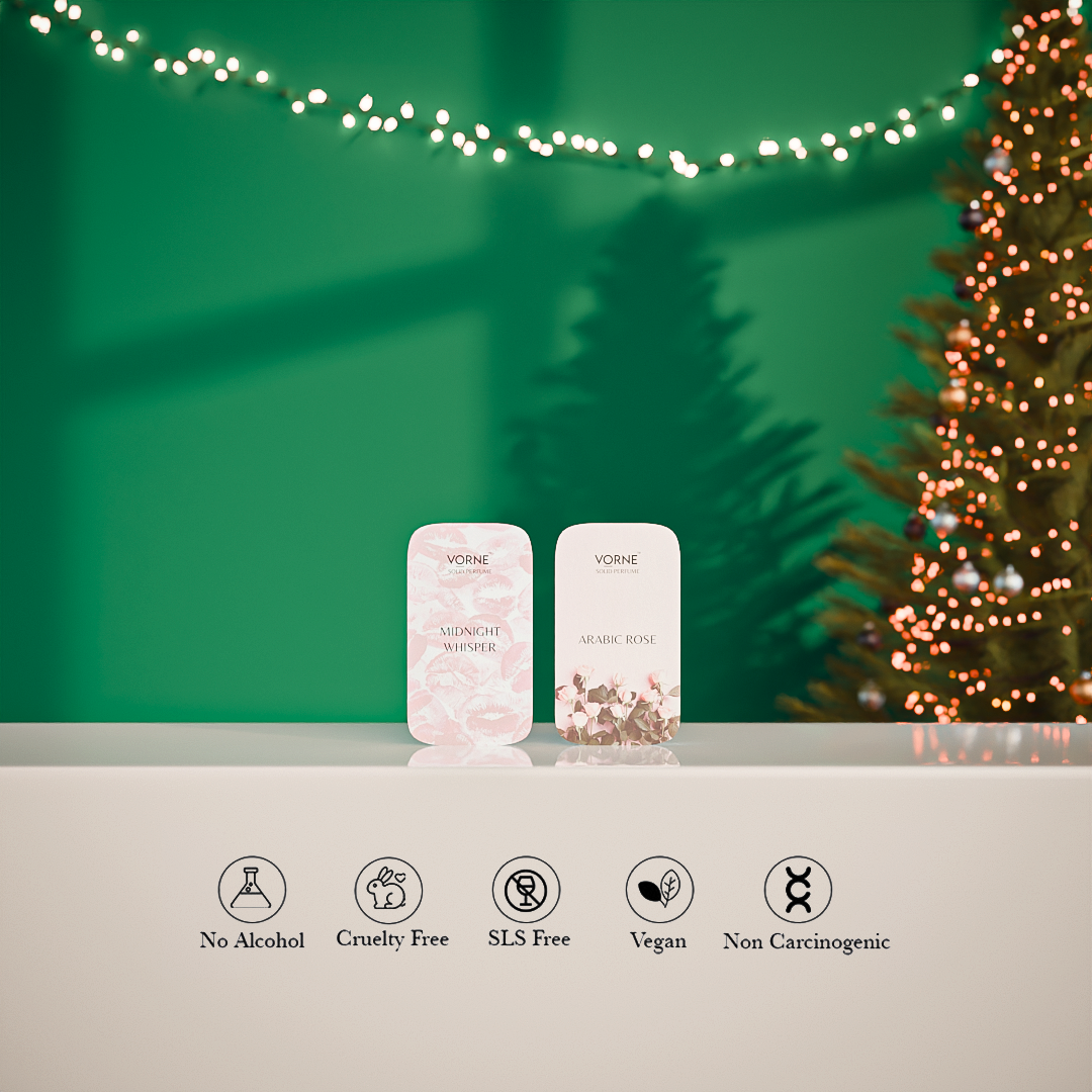 Celebrate this festive season with the VORNE Midnight Whisper & Arabic Rose Solid Perfume Gift Set, crafted as the perfect Christmas and New Year present for women. This premium duo includes two long-lasting solid fragrances ideal for holiday gifting, party wear and daily use. Midnight Whisper offers a deep, mysterious floral aroma with warm undertones—perfect for evenings, celebrations and winter nights. Arabic Rose brings a timeless rose-based scent, elegant, feminine and comforting, ideal for daytime or romantic occasions. Both fragrances come in compact, spill-proof tins, making them perfect for travel, office, handbags and festive outings. The smooth balm texture allows easy application on pulse points, ensuring a subtle yet long-lasting fragrance that stays close to the skin. Whether you’re gifting for Christmas, Secret Santa, New Year or festive hampers, this elegant perfume combo adds luxury, charm and warmth to every occasion.