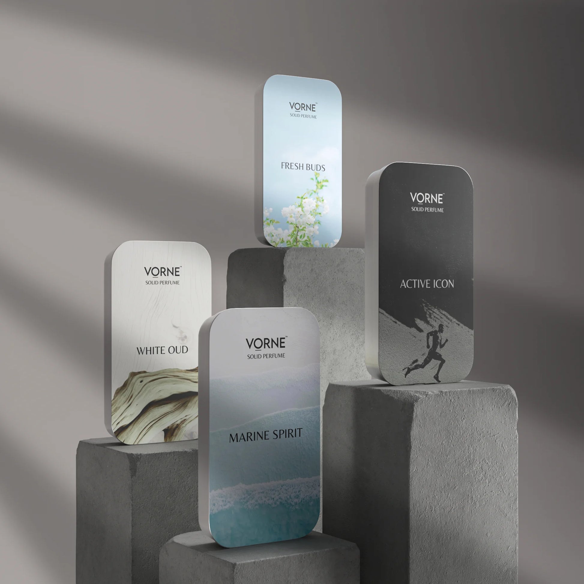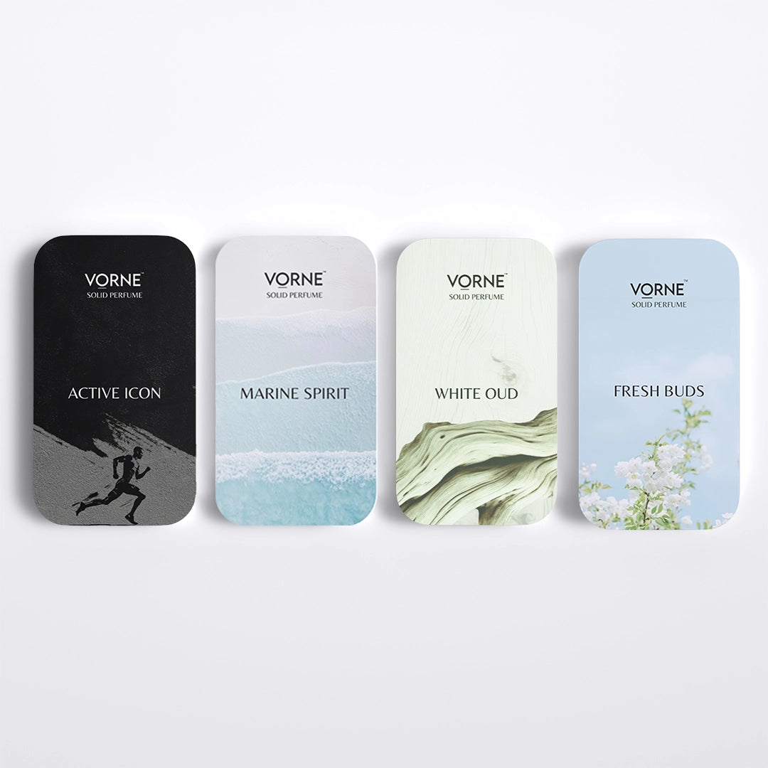 India's most concentrated solid perfume | Pack of 4 (4* 10g) Alcohol free cologne. Set of 4 Solid Perfume for Men. Active Icon, Marine spirit, White Oud, Fresh Buds.