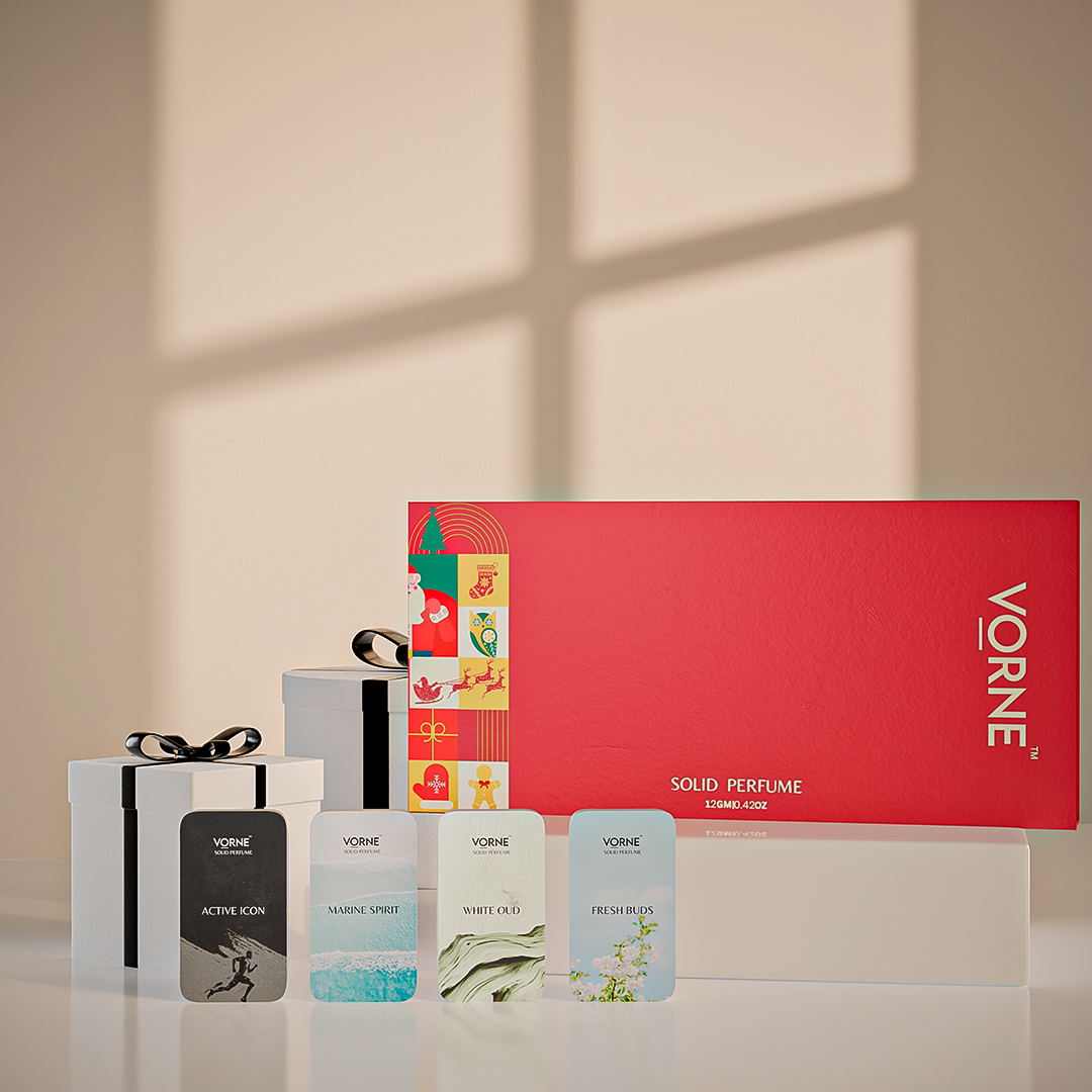 One gift, four signature scents. Four of VORNE's bestselling men's solid perfumes in one premium gift box - a full fragrance wardrobe in one go.
